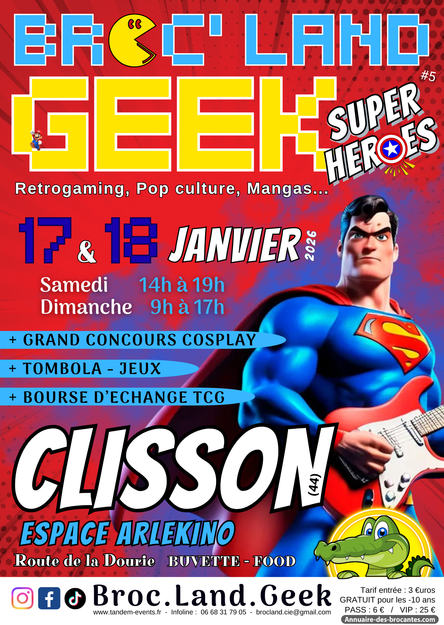 Ne manquez pas l'Evènement BROC' LAND GEEK - CLISSON 2026 le samedi 17 et dimanche 18 JANVIER 2026... . Durant cette journée, ce salon rassemble de nombreux exposants venus de toute la région et des régions limitrophes sur une surface de 800 m², dont l’objectif est de vendre, d’échanger ou de partager leur passion : Jeux vidéo, pop culture, jouets vintage, lego, playmo, univers steampunk, jeux de rôle, héros, fantasy, sciences fiction, monde imaginaire, figurines, mangas, consoles de salon, miniatures, skylanders, illustrations, décoration, cartes à jouer, pet-shop, comics, bandes dessinées, jeux de société, livres de SF, Fantastique, dvd, films cultes, jeux de cartes, goodies de séries TV actuelles et rétro, etc... . Lieu : ESPACE ARLEKINO Route de la Dourie 44 190 CLISSON . Horaires : Samedi : 14h - 19h Dimanche : 9h - 17h . NOMBREUSES ANIMATIONS : . *** GRAND CONCOURS LIKE MY COSPLAY *** Chaque candidat inscrit avant le 15 Janvier 2026 recevra une invitation au BLG et devra récolter dans les allées du salon pendant les 2 jours un maximum de likes. Le vote du public et uniquement le vote du public sera pris en compte par le nombre de mentions "J'aime" via un QR CODE (afficher sur le salon). Le grand gagnant sera annoncé le dimanche à 16h et remportera un trophée et un bon d'achat de 100 euros à dépenser au salon. Formulaire d'inscription pour les cosplays : https://forms.gle/TQj3PCmuH4Dvtx6UA Lien du concours facebook : https://www.facebook.com/events/1339600920827821/ . *** JEU CONCOURS PASS*** Avec ton Pass Coupe file participe au Jeu-concours et tu auras peut-être la chance de gagner 1 console de jeu rétrogaming... - Tirage au sort à 16h30 - Achat billetterie uniquement sur weezevent : https://my.weezevent.com/CLISSON2026 Si absent lors du tirage, le lot vous sera envoyé en colis suivi. . *** COMBAT DES BLASONS *** Choisis ton blason en arrivant sur le site du BLG avec ton téléphone portable et accomplis des défis, quêtes et épreuves pour gagner des points de prestige... Le blason ayant accumulé de plus de points le dimanche à 16h sera proclamé vainqueur du tournoi des Blasons. . *** BOURSE D'ECHANGE TCG (Trading Card Game) *** Ce sera l'occasion parfaite de partager, compléter votre collection et rencontrer d'autres passionnés dans un espace dédié aux cartes : Pokémon - Dragon Ball - One Piece - Lorcana - Yu Gi Oh - Magic - Altered - Etc... . BUFFET - BUVETTE . BILLETTERIE SUR PLACE : 3 €uros GRATUIT pour les -10 ans et PMR . PRE-VENTE PASS COUPE FILE + JEU CONCOURS : 4 €uros "Offre jusqu'au 18 Décembre 2025" Entrée sans file d'attente et participe au Jeu-concours pour gagner 1 display. Achat billetterie uniquement sur weezevent https://my.weezevent.com/CLISSON2026 . PASS COUPE FILE + JEU CONCOURS : 6 €uros Entrée sans file d'attente et participe au Jeu-concours pour gagner 1 console de jeu rétrogaming. Achat billetterie uniquement sur weezevent https://my.weezevent.com/CLISSON2026 . PASS COUPE FILE FAMILY + JEU CONCOURS : 20 €uros 2 adultes + 2 enfants Entrée sans file d'attente et participe au Jeu-concours pour gagner 1 console de jeu rétrogaming. Achat billetterie uniquement sur weezevent https://my.weezevent.com/CLISSON2026 . PASS CULTURE Tarif normal : 3 €uros Tarif Pass Coupe file : 6 €uros Réservations "Duo" acceptées https://passculture.app/offre/366287587 . PASS VIP - Accès avant ouverture officielle : 25 €uros Entrée déballage marchand - Donne accès avant l'ouverture officielle au public pendant l'installation des exposants le samedi de 11h à 19h et dimanche de 7h à 17h Achat billetterie uniquement sur weezevent https://my.weezevent.com/CLISSON2026 . Organisation : Tandem Events France https://www.tandem-events.fr/ . Renseignements : brocland.cie@gmail.com Infoline : 06 68 31 79 05 . *** INSCRIPTION EXPOSANTS *** Demande via formulaire : https://forms.gle/sXcyFn4FDHisPera9 Contact Nathalie : commercial.tandem.events@gmail.com . Merci de partager l'évènement : https://www.facebook.com/events/24413778234968746/ . Bon Salon à Tous...