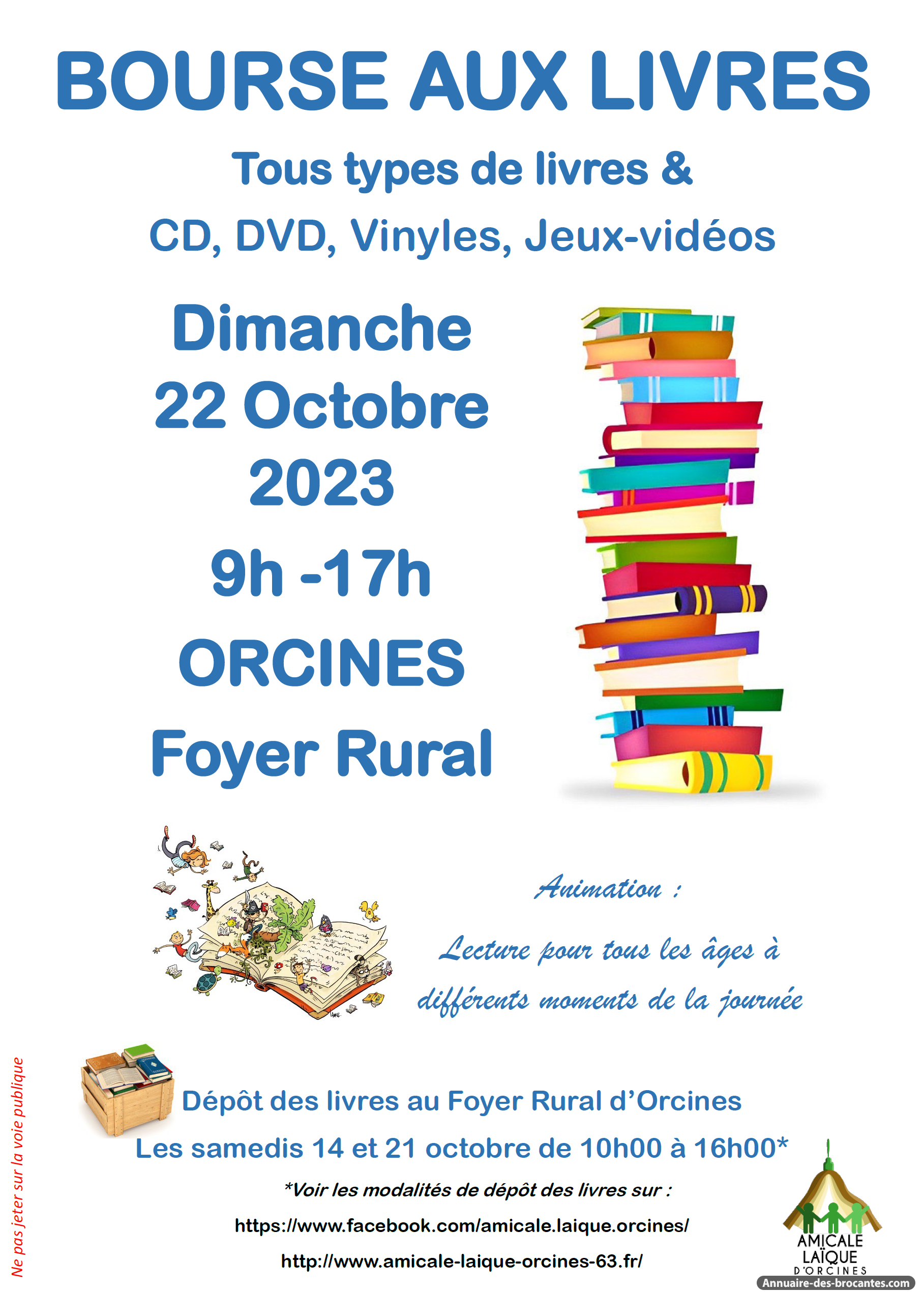 Ous venez déposer vos livres, les samedis 14 et 21 Octobre 2023, par liste de 20 articles (livres, ou cd/dvd/vinyles) avec le prix souhaité de vente.