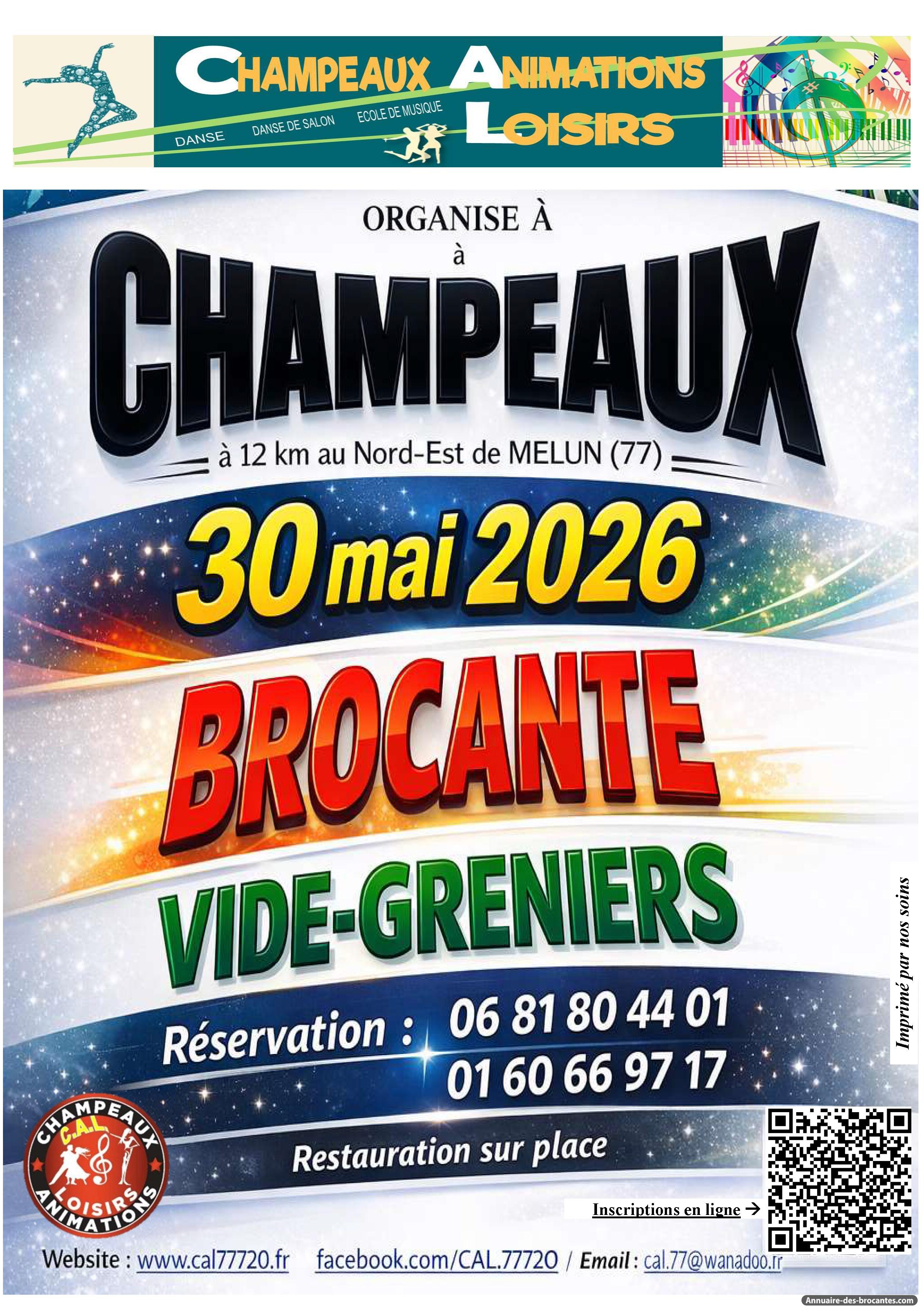 Le CAL organise, le samedi 30 mai 2026, une brocante/vide-greniers à CHAMPEAUX (77), à 12 km au nord-est de MELUN. Elle se déroulera sur la place du marché et rue Raoul Coutant, toute la journée. Possibilité de restauration sur place. Visiteurs : Entrée libre Tarifs exposant : 5,00 €/ML lors de l’inscription préalable sinon 7,00 € le jour de la brocante. Réservations : 06.81.80.44.01 ou cal.77@wanadoo.fr https://cal77720.fr/vos-rendez-vous/ Site : https://cal77720.fr/